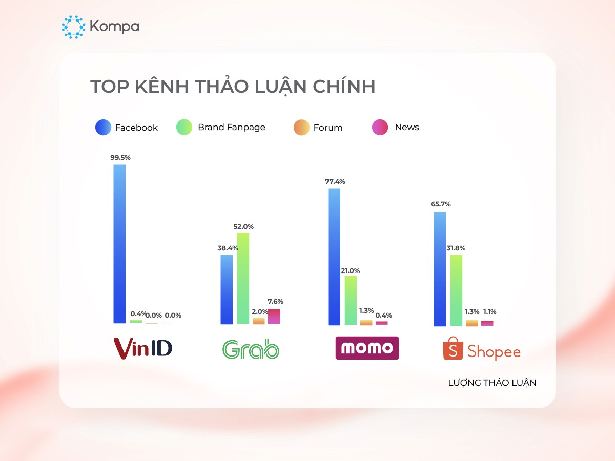 Facebook là kênh thu hút thảo luận chủ yếu. Các thảo luận cũng đến từ fanpage của thương hiệu, kênh diễn đàn và tin tức. VinID có 99,5% lượng thảo luận từ Facebook. Grab có lượng thảo luận chủ yếu trên fanpage của thương hiệu.