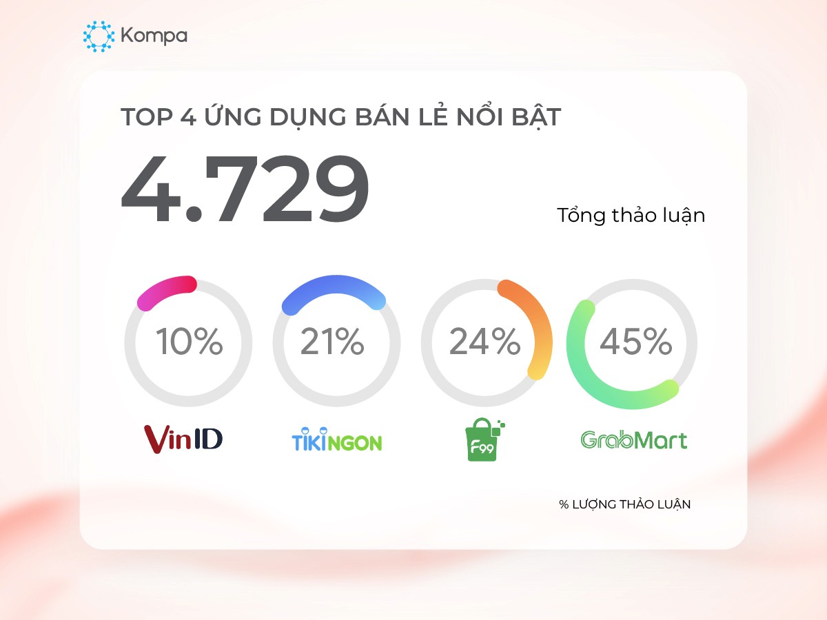 VinID, F99 Việt Nam, TikiNGON, Grab Mart là 4 ứng dụng được thảo luận nhiều nhất về chủ đề bán lẻ.VinID chiếm 10% tổng thảo luận với chương trình [Cẩm nang mua sắm] Vui tết Trung Thu – Rước Deal Linh Đình, TikiNGON và GrabMart lần lượt là 21% và 24% tổng thảo luận qua minigame tương tác và các đề cập trên fanpage của đối tác. F99 Việt Nam chiếm 45% tổng 4.729 thảo luận thông qua livestream bán hàng trên fanpage của ứng dụng.