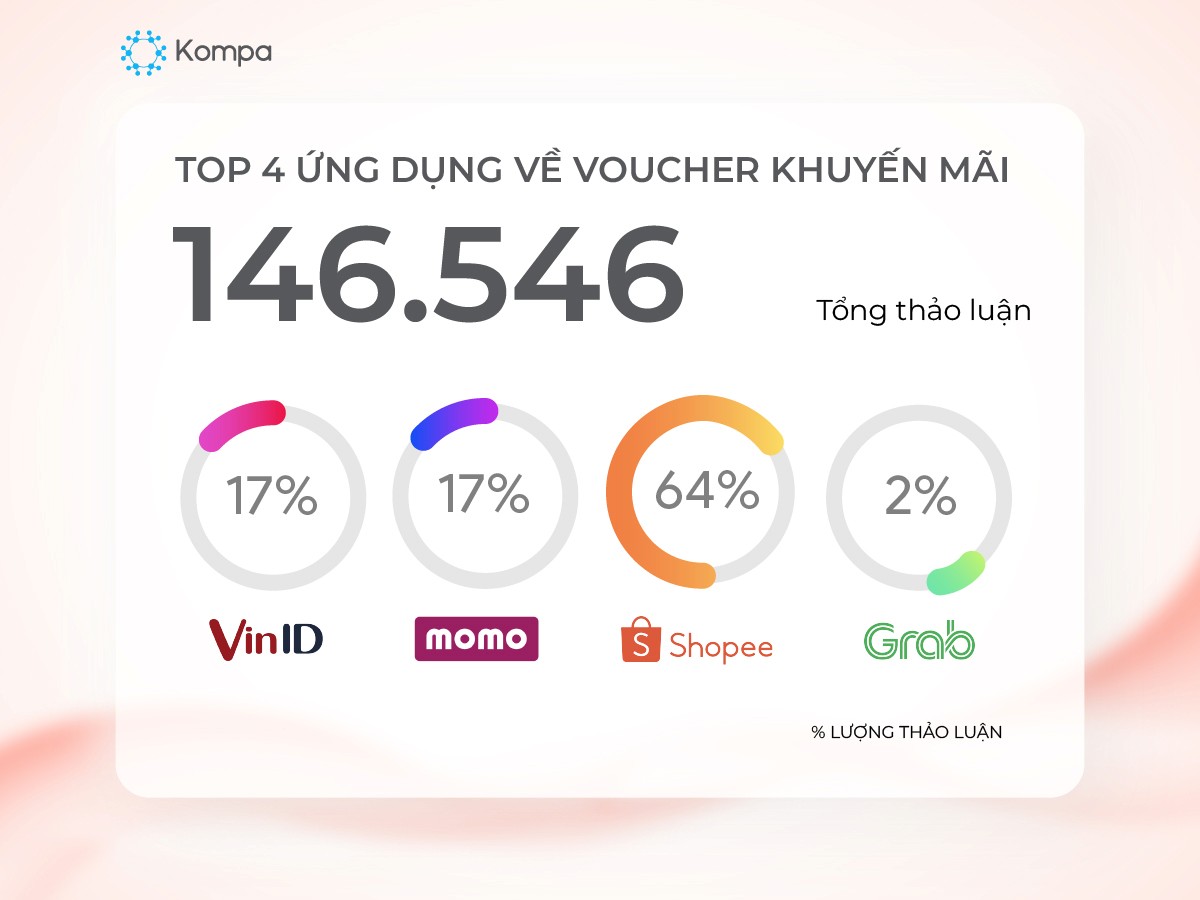 VinID, Momo, Grab, Shoppee là 4 ứng đụng hàng đầu được người dùng đề cập thảo luận về chủ đề voucher khuyến mãi. VinID và Momo nhận được lượng thảo luận ngang bằng nhau 17% trên tổng thảo luận 146.546. Chương trình Livestream trên kênh Youtube Panasonic là chủ đề nổi bật thu hút thảo luận cho VinID. Momo, Grab, Shopee thu hút thảo luận ở các chương trình minigame của thương hiệu.