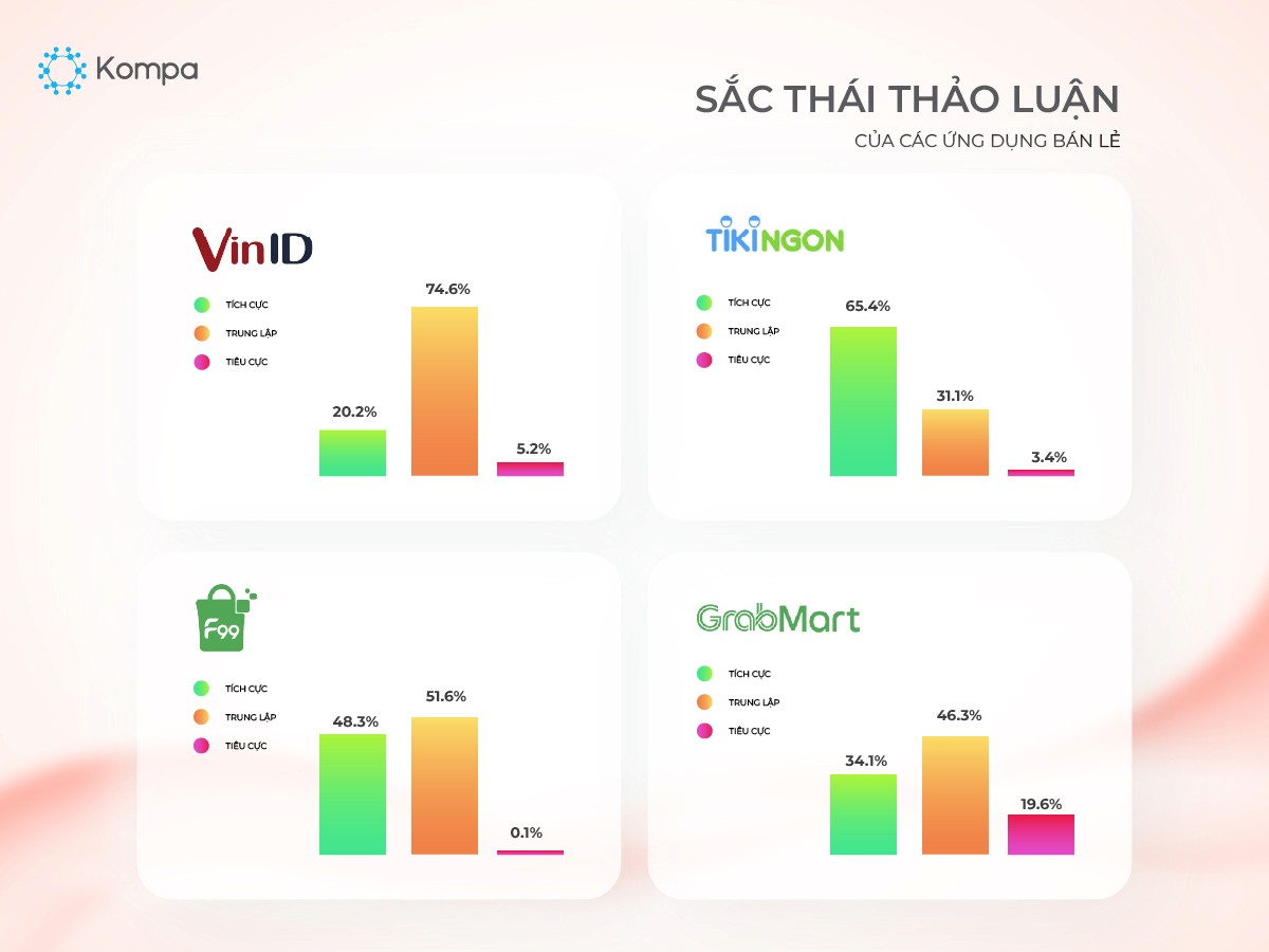 VinID đạt 96.6% tích cực, Momo là 69.2%, Shopee 50.2%, Grab 47.3%.