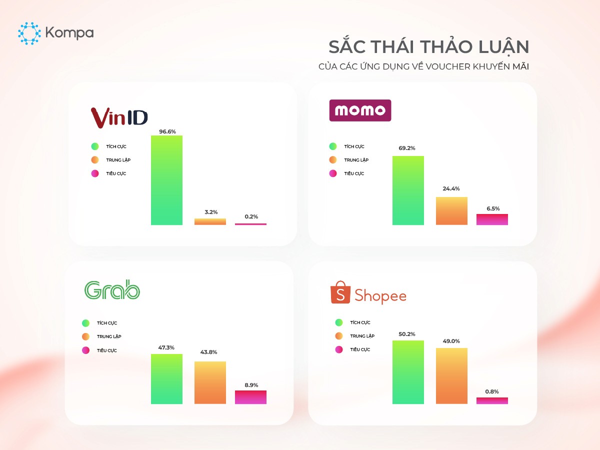 VinID nhận được các thảo luận tích cực từ chuỗi livestream của nhãn hàng Panasonic, người dùng tham gia livestream sôi nổi để nhận voucher của VinID. Grab nhận được các thảo luận về vấn đề giá cước chưa giảm khi giá xăng đang có chiều hướng giảm. Momo nhận được các thảo luận tích cực và trung lập khi tặng voucher cho đa ngành hàng đặc biệt du lịch, thực phẩm đồ uống, ngoài ra ứng dụng có được người dùng phản hồi về các lỗi đăng nhập, các vấn đề tải trang hoặc cập nhật hệ thống.