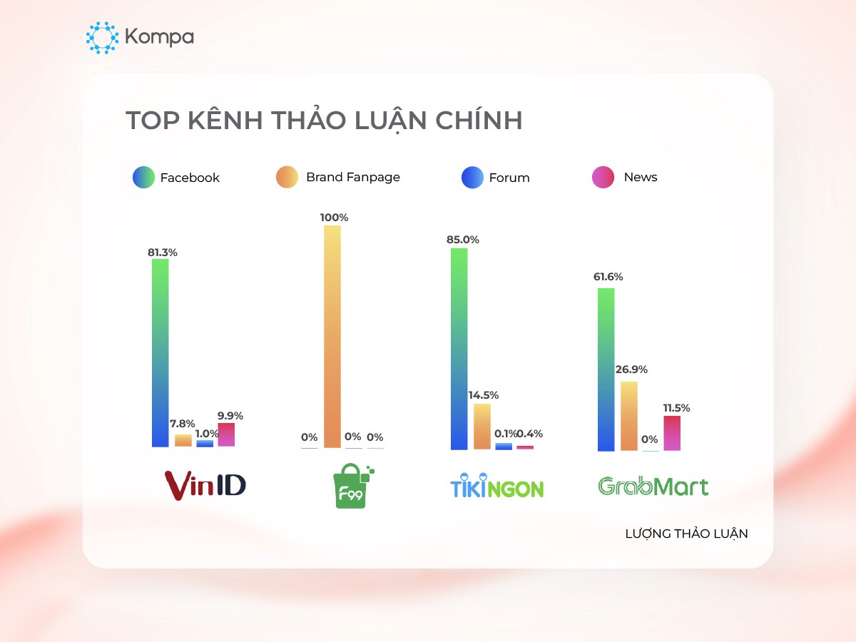 Lượng thảo luận đến chủ yếu từ Facebook gồm người dùng facebook và Brand Fanpage, ngoài ra các kênh diễn đàn và tin tức cũng thu hút một lượng thảo luận. VinID có 81.3% lượt thảo luận chủ yếu từ người Facebook, trên fanpage là 7.8%. TikiNGON có 85% từ người dùng Facebook, 14.5% từ fanpage. F99 có 100% thảo luận tập trung trên fanpage.